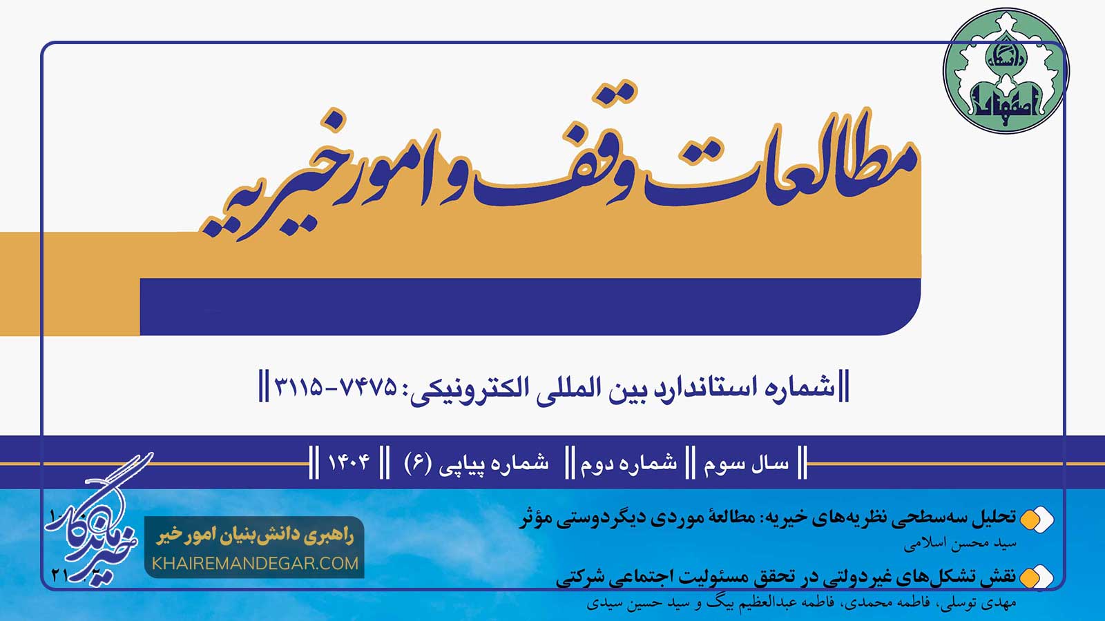 به گزارش واحد روابط عمومی خیر ماندگار، با همکاری دانشگاه اصفهان و پژوهشکده مطالعات وقف و نیکوکاری(خیر ماندگار)، ششمین شماره دو فصلنامه «پژوهشنامه مطالعات وقف و امور خیریه»، به عنوان اولین و تنها پژوهشنامه علمی_پژوهشی مطالعات وقف و امور خیریه دارای مجوز رسمی از وزارت علوم، تحقیقات و فناوری در کشور، منتشر شد.